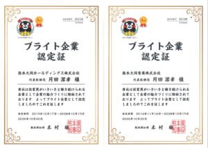 2025年11月22日 お知らせ ブライト企業の更新認定について この度、熊本県の「ブライト企業」について、あらためて認定を受けましたのでお知らせいたします。 熊本大同ホールディングス株式会社が3rd認定、熊本大同青果株式会社が4rd認定になります。 今後も、働く人がいきいきと輝き、安心して働き続けられる企業をつくり、社員の満足度向上、地域社会の発展に貢献してまいります。。