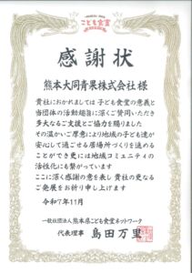 2025年12月05日 お知らせ 熊本県子ども食堂ネットワーク様より感謝状をいただきました。 この度、一般社団法人熊本県子ども食堂ネットワーク様より、感謝状をいただきました。 これからも地域の活性化やコミュニティの形成に貢献してまいります。